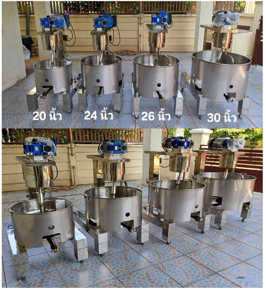 ในรูปเป็นเครื่องกวน เครื่องกวนผสมอาหาร กระทะสแตนเลส ขนาด 24 นิ้ว ตัวโครงเครื่องกวนผสม และกระทะทำจากสแตนเลสเกรดอาหาร 304 ใบกวนทำจากเทฟลอน Food Grade ทนทาน ทำความสะอาดได้ง่าย มีความปลอดภัยสูงและถูกสุขลักษณะ ชุดกวนผลิตภัณฑ์สามารถยกเอียงได้ แกนก้านกวนออกแบบให้มี 2 แกน คือแกนใบกวน มีลักษณะเอียง ไม่ตั้งฉากกับกระทะ โดยมีใบกวน 2 ใบ การหมุนกวนของก้านกวนจะหมุนกวนรอบตัวเองและหมุนไปรอบๆก้นกระทะ ช่วยการกวนไส้หรือผลิตภัณฑ์ส่วนก้นกระทะ ทำให้กวนได้ทั่ว อาหารไม่ติดก้นกระทะ หมุนตัดของที่กวนได้ดีกว่าแกนกวนตรงๆ ของที่กวนกระจายตัว ไม่ติดเป็นก้อน กวนไส้ได้เนื้อเนียนละเอียด นอกจากนี้ยังออกแบบให้มีใบกวนไส้กวาดข้าง ช่วยกวาดผลิตภัณฑ์ข้างกระทะอีกด้วย ลูกค้าสามารถใช้กวนได้หลายอย่าง เช่น ผลไม้กวน ถั่วกวน ไส้ขนมต่างๆ หรือของเหลวอื่นๆ ด้านล่างมีช่องไว้สำหรับใส่หัวเตาแก๊ส มอเตอร์เกียร์ทดรอบ 1 แรงม้าวางด้านบน ทำให้มีแรงบิดที่เพิ่มมากขึ้น แต่กำลังในการกวนยังคงเท่าเดิม และเครื่องไม่ร้อนขณะทำการกวน