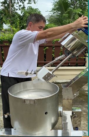 เครื่องกวน เครื่องกวนไส้ที่มาพร้อมชุดหัวตีหรือแขนผสมสามารถปรับเอียงได้ด้วยตนเองเพื่อให้สามารถขนถ่ายอาหารในกระทะได้ง่ายมากขึ้น