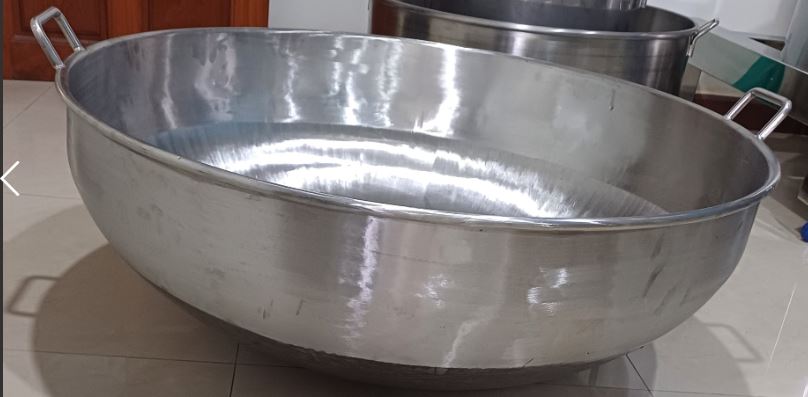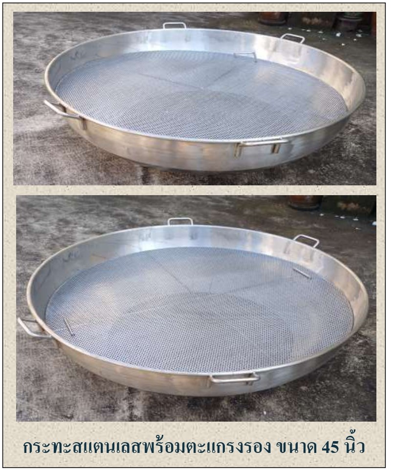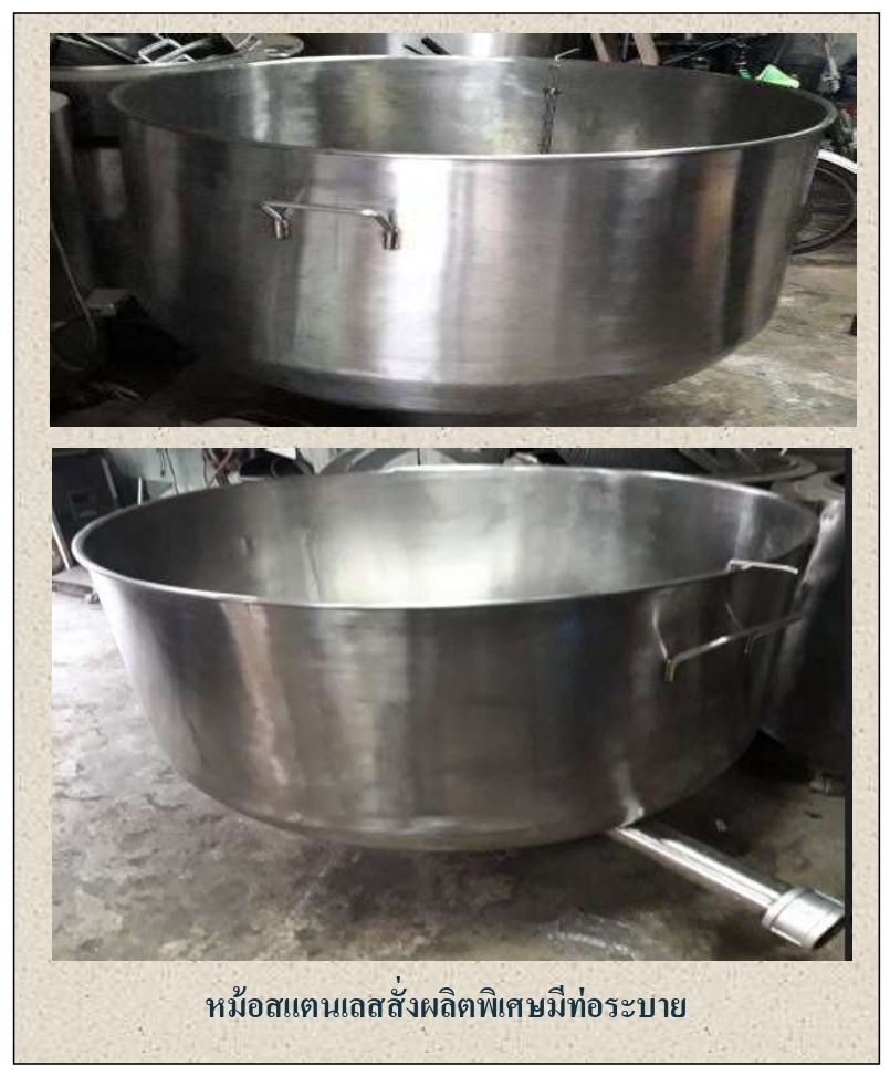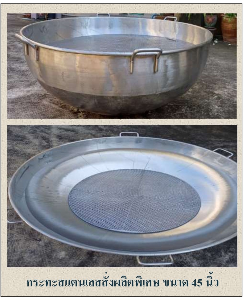 3. กระทะสแตนเลสกวนไส้ กระทะสแตนเลสเป็นรุ่นขอบม้วน มีขนาดให้เลือกตั้งแต่ 20, 24, 26 และ 30 นิ้ว หรือสามารถสั่งทำในขนาดที่ใหญ่ขึ้นตามต้องการ