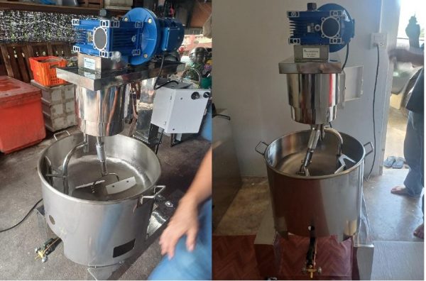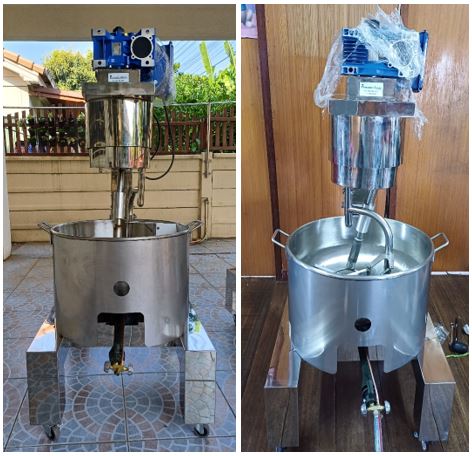 3) กระทะสแตนเลส ขนาด 26 นิ้ว ขนาดตัวเครื่องกวน 85 x 115 × 150 cm (width x length × height) มีความจุมากถึง 40 ลิตร