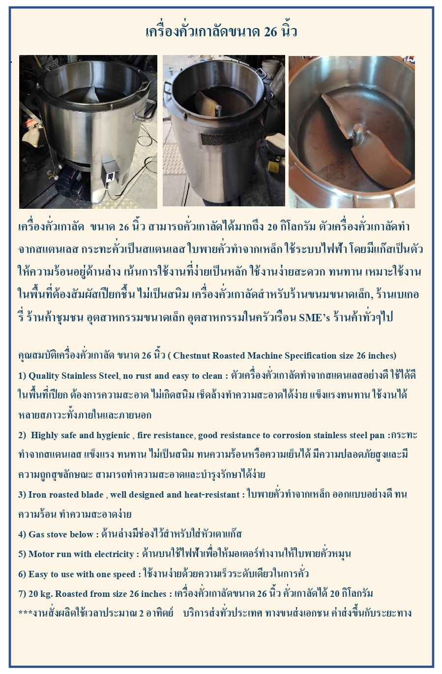 เครื่องคั่วเกาลัดมีให้เลือก 2 ขนาด คือ ขนาด 22 นิ้ว และ ขนาด 26 นิ้ว