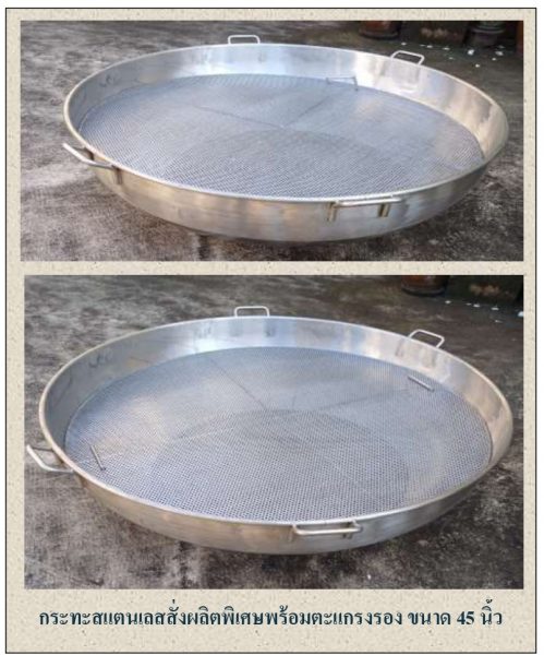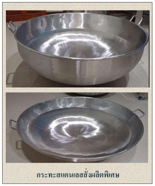 3. กระทะสแตนเลสกวนไส้ กระทะสแตนเลสเป็นรุ่นขอบม้วน มีขนาดให้เลือกตั้งแต่ 20, 24, 26 และ 30 นิ้ว หรือสามารถสั่งทำในขนาดที่ใหญ่ขึ้นตามต้องการ